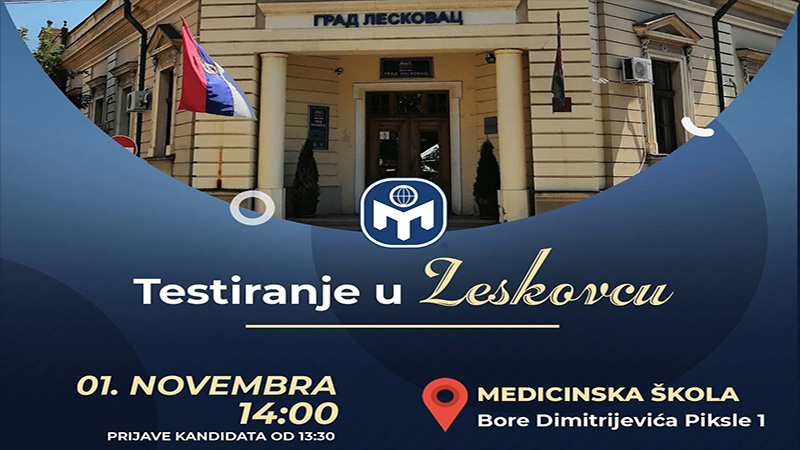 Svrha uplate: Testiranje u — (upisati mesto testiranja, u ovom slucaju LESKOVAC);
